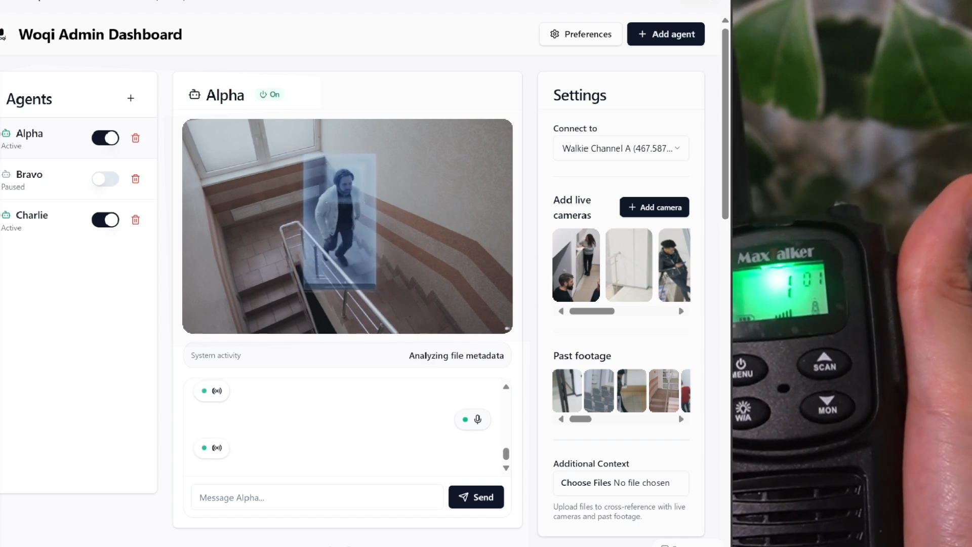 Woqi is an AI assistant for security and tactical teams. Woqi continuously monitors and analyzes surveillance footage in real time, and can quickly retrieve information, locate targets, and handle custom requests from ground personnel.